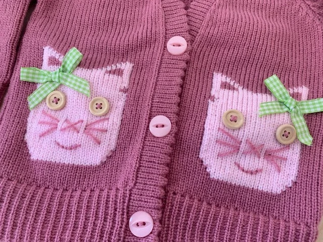 It has a v-neck and buttons at the front and features a delightful cat motif.