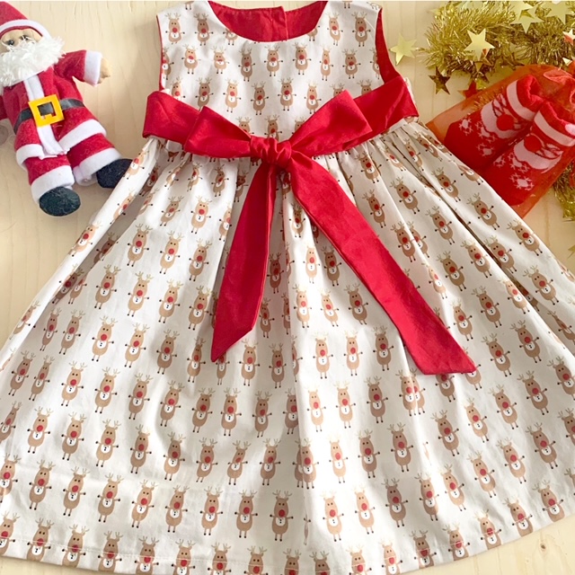 This dress is made from a lovely 100% cotton fabric with a pretty reindeer design.  The main colour is cream. The bodice is lined in contrasting red fabric and there is a matching red tie belt which can be fastened in a bow at the front or the back.
