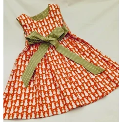 This dress is made from 100% soft cotton fabric with a pretty snowman design. The background colour is red and there are accents of white and green. The tie belt and the bodice lining are in a green dotty fabric.