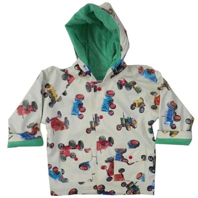 Tractor design shower resistant PU raincoat by Powell Craft is fully lined in green towelling fabric and has two pockets and popper fastening